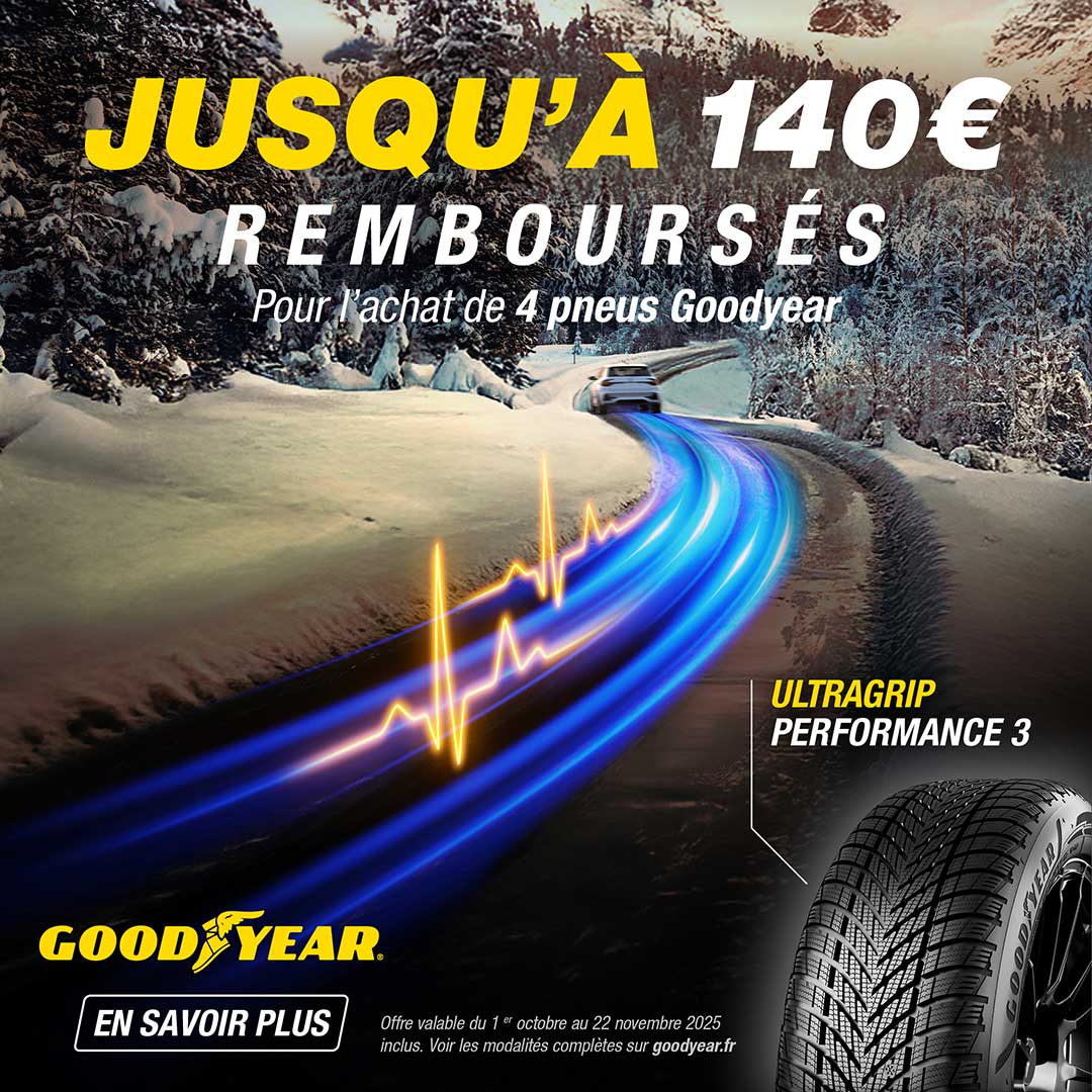 (1) Entre le 1er octobre et le 22novembre 2025 inclus, pour l’achat simultané et le montage de 2 ou 4 pneus de 15 pouces et plus de marque Goodyear des gammes Tourisme, 4×4, V.U., été, 4 saisons et hiver, porteurs de l’offre, dans un des points de vente participant ou sur le site internet d’un point de vente participant à l’opération, et si vous êtes parmi les 17 000 premières inscriptions, vous pourrez bénéficier d’un remboursement par virement bancaire pouvant aller jusqu’à 140 euros. Le montant du remboursement sera fonction du nombre et de la dimension des pneus achetés. Les modalités complètes sont disponibles dans les points de vente participant à l’opération et sur www.goodyear.fr.
